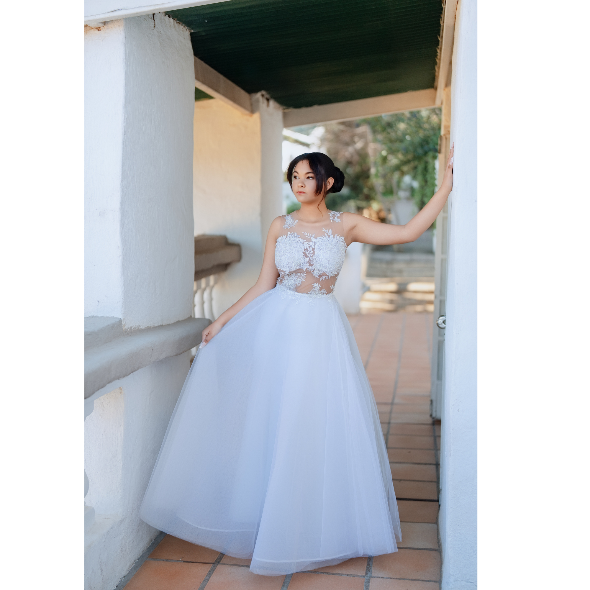The Achillea dress features a mermaid silhouette with a delicate illusion top adorned with intricate lacework and subtle beading on the bodice. A tulle overskirt adds soft volume and movement, while a row of buttons down the back provides refined detailing. This combination of a fitted shape, ornate bodice, and flowing overlay creates a modern bridal look that balances sophistication with romantic elegance.