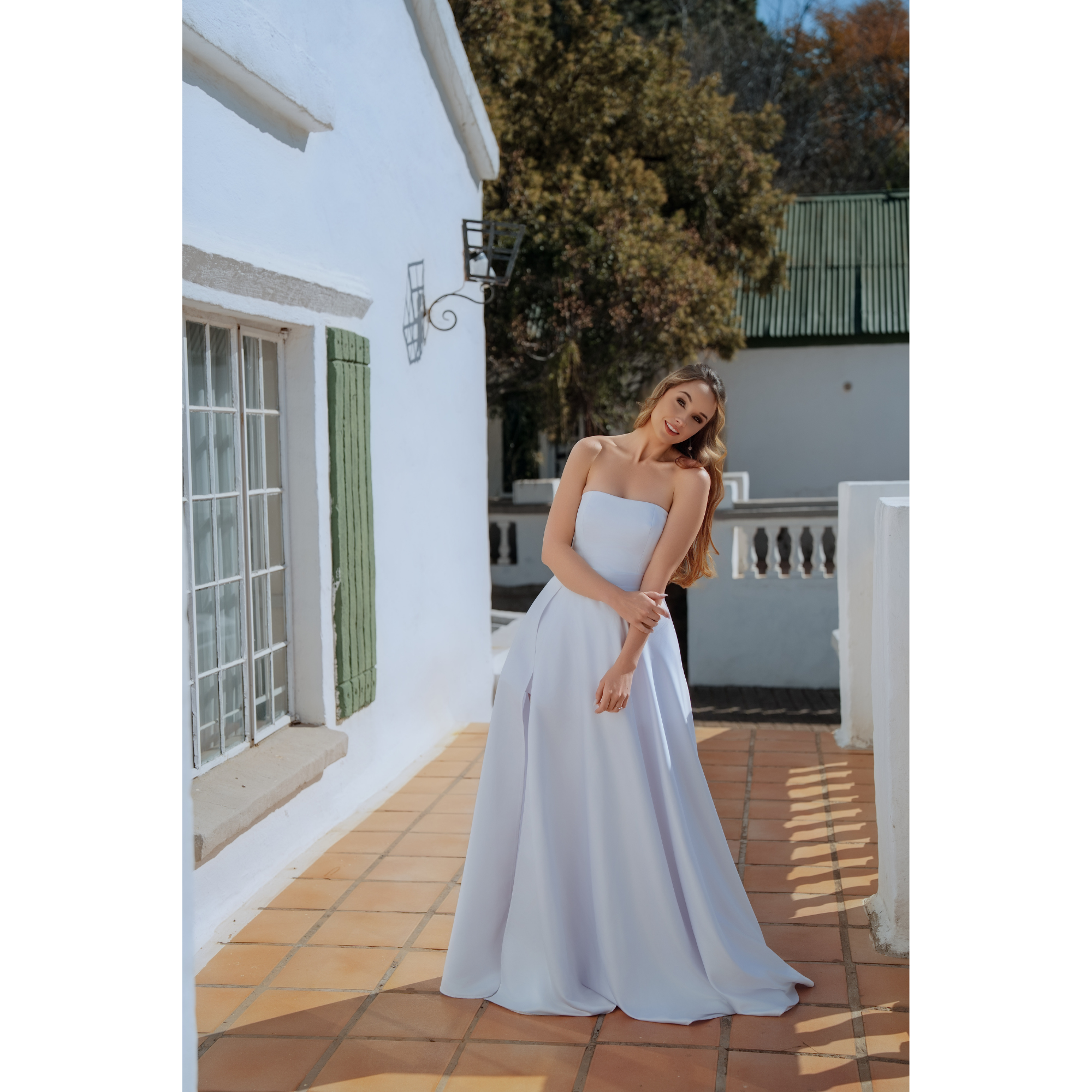 The Calla Lily wedding dress features a sleek satin design with a straight-cut neckline and a graceful half circle skirt with side slit , inspired by the elegant line of the calla lily flower. Its minimalist silhouette emphasises fluid movement while maintaining a modern, sophisticated bridal look, perfect for brides seeking understated elegance with a touch of allure.