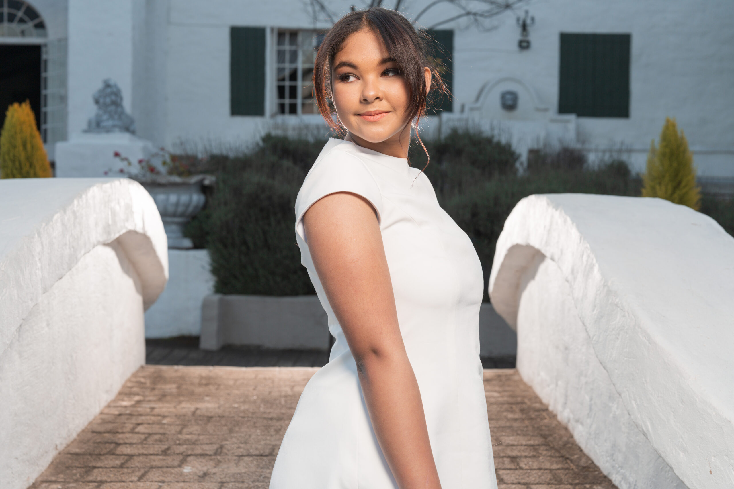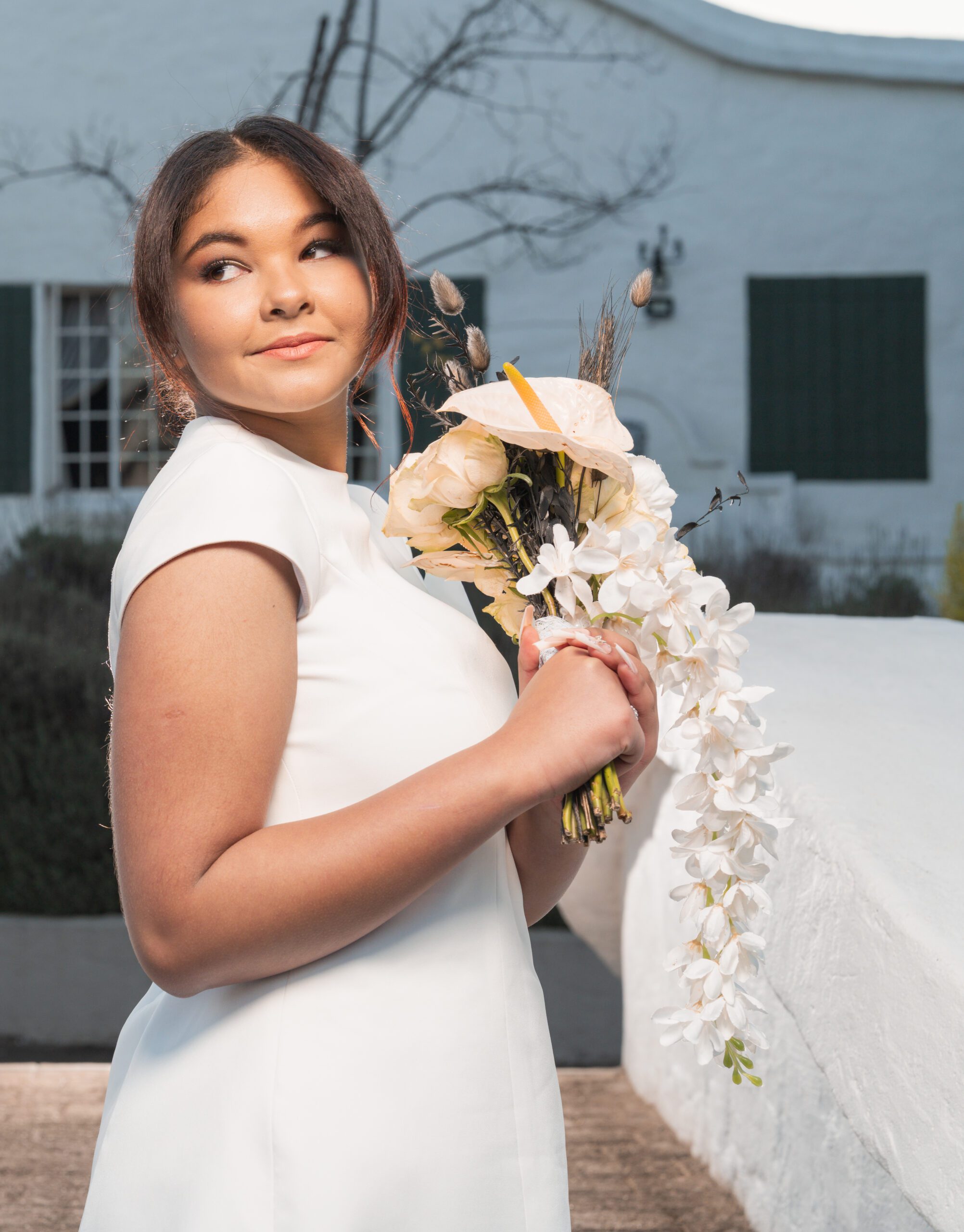 A high, minimal neckline and cap sleeves add a contemporary edge, while the precise tailoring ensures a polished finish from every angle. The hemline sits above the knee, making Jasmine ideal for civil ceremonies, engagement shoots, bridal events, or modern reception looks.