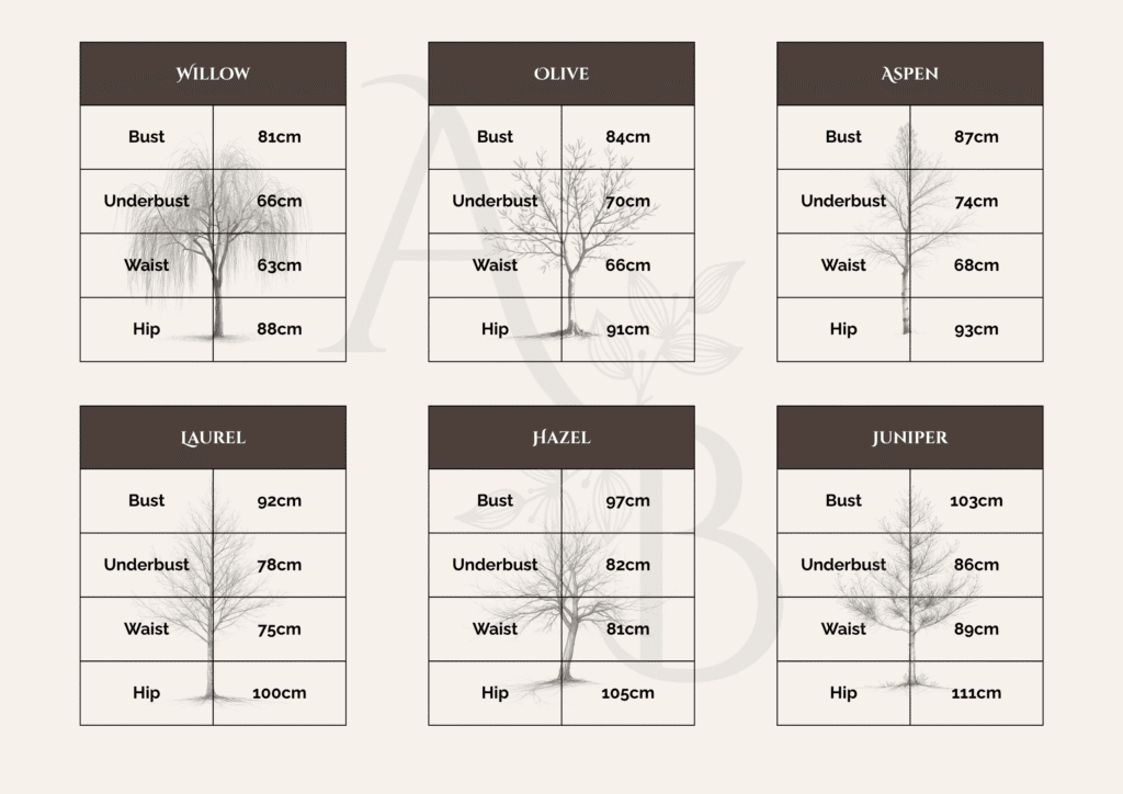 That’s why our sizes are named after trees—each representing a standardised silhouette designed to suit a range of forms gracefully. But we know that every bride is unique, so we also offer fully custom gowns, crafted from the very first measurement to your exact shape. Like trees, every branch, leaf, and root is distinct, and each dress is made to honour the individuality of the bride who wears it.